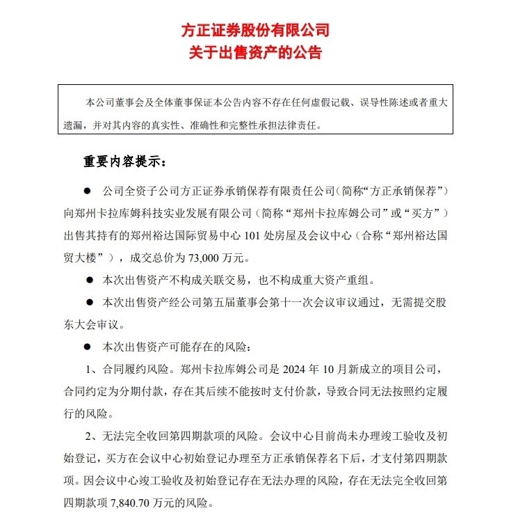 2月17日晚间,方正证券突然公告称,公司全资子公司方正证券承销保荐有限责任公司拟向郑州卡拉库姆科技实业发展有限公司出售其持有的郑州裕达国际贸易中心101处房屋及会议中心(郑州裕达国贸大楼),成交总价为7.3亿元。